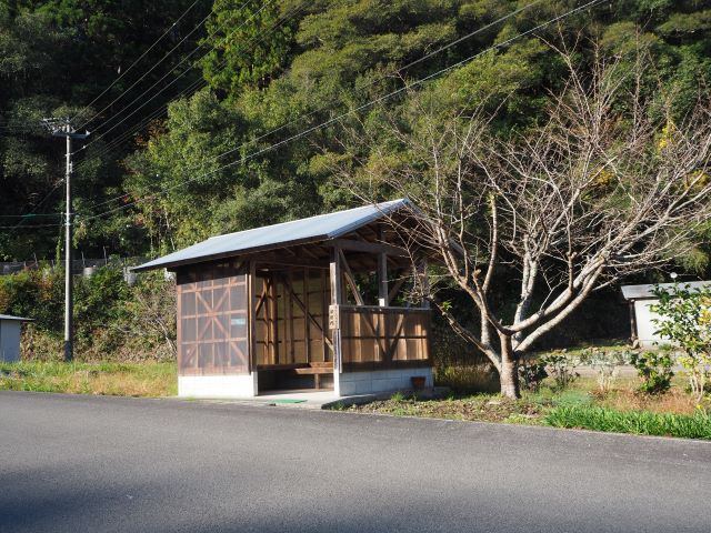 横波から約2km30分ほど歩くと、山道に入る看板の前に、「おへんろさん休憩所」がある。